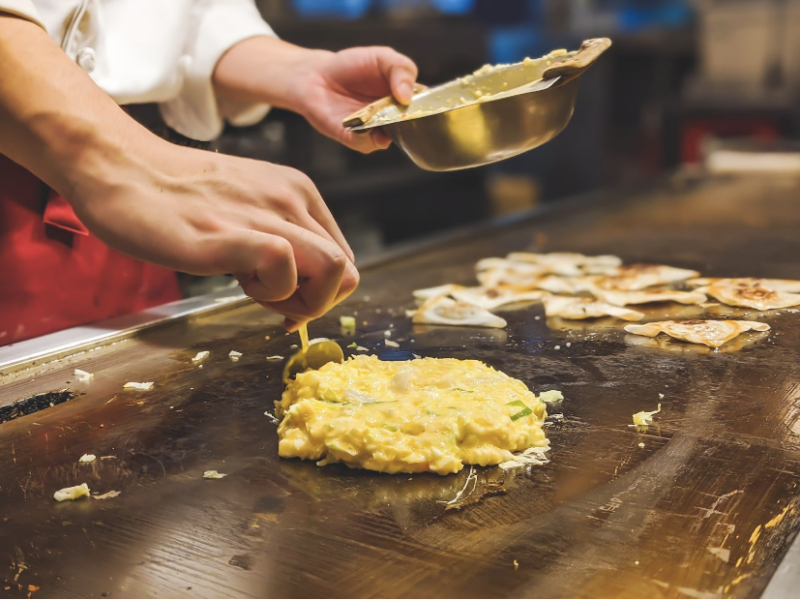 Next, stir the beaten eggs into it gradually and mix. Tip: If it seems too dry, set it aside for 10 minutes. After that, heat a large griddle over medium-high heat and brush it with oil.