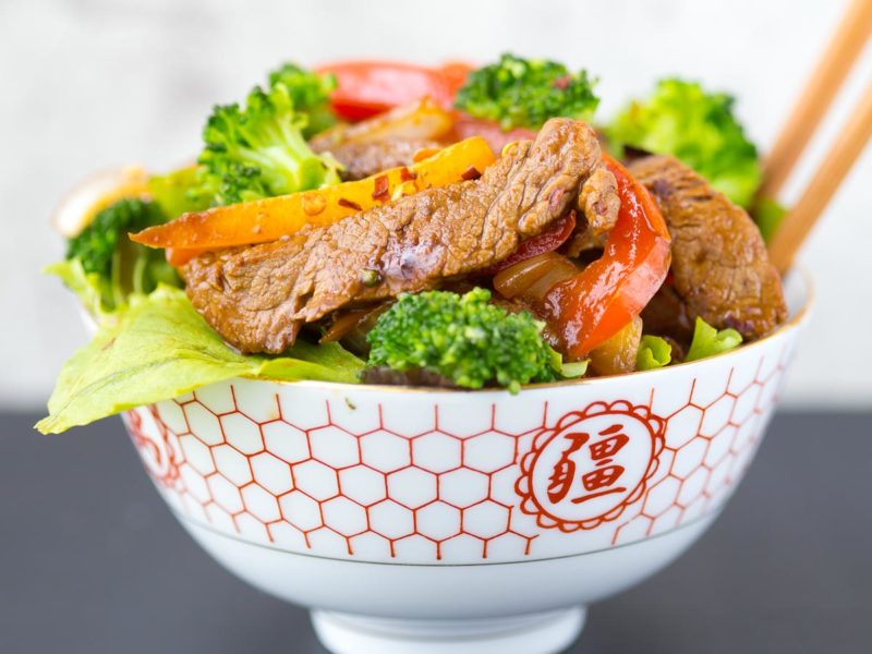 - Add mixed greens to your plate and top with your stir fry or do what we did and steam some fresh veggies for the side