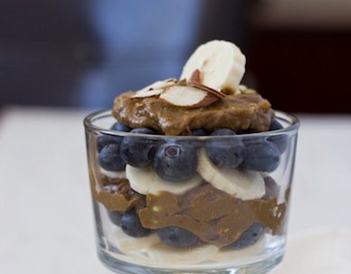 - Slice your banana up and start making layers of banana, then blueberries, then avocado pudding. Top with your sliced almonds and serve.