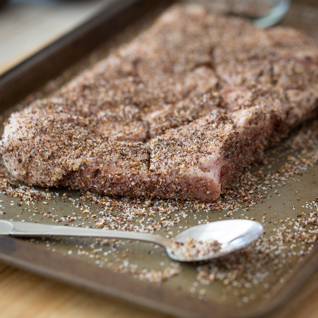 - Mix your choffy (or cocoa powder), coffee, sea salt, and black pepper together and liberally season your pork belly over the checkerboard. Ensure you get seasoning into the grooves