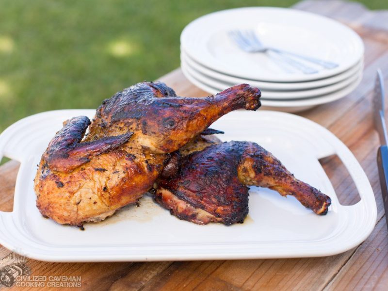 - If you are going to grill this chicken, preheat the grill for medium high heat. Once preheated, place chicken halves on direct heat and grill for 10 minutes a side to crisp, then move over medium indirect heat for ~30 more minutes or until an internal temperature of 160 degrees is reached in the breast or 180 in the thigh