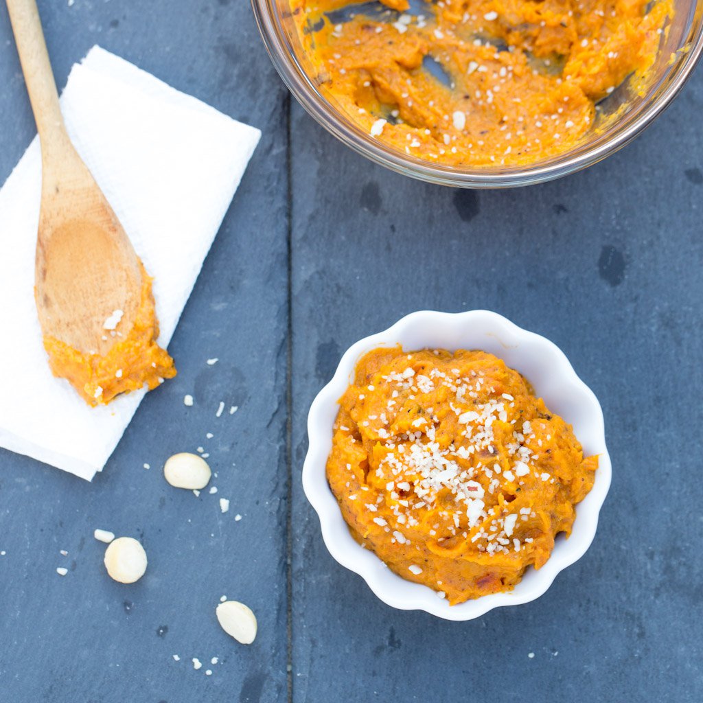 - Scoop out your delicious roasted puree and place in a bowl, use your remaining 1/4 cup of macadamia nut meal to sprinkle on top