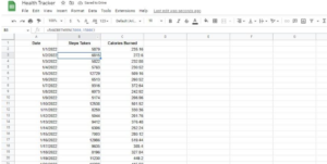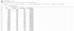 The next column I’m adding to the spreadsheet is the steps taken during the day. These can be monitored using a mobile application or a fitness tracker, as I mentioned before. You can log these in manually every day, and there is no need to enter a formula here. But, you could use Google Apps Script to import Google Fit steps.