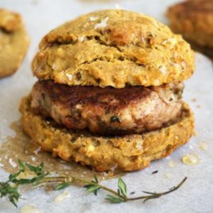 Scoop ¼ cup dough onto prepared baking sheet to create round biscuits. Sprinkle with flaked sea salt. Bake in preheated oven for 20 minutes. Remove and let cool slightly before slicing and serving with homemade pork sausage and a drizzle of honey.