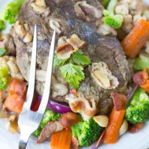 Using a thin knife create about 12 holes deep into the meat about 1/2 inch wide, you need to be able to fit some garlic and bacon in the hole