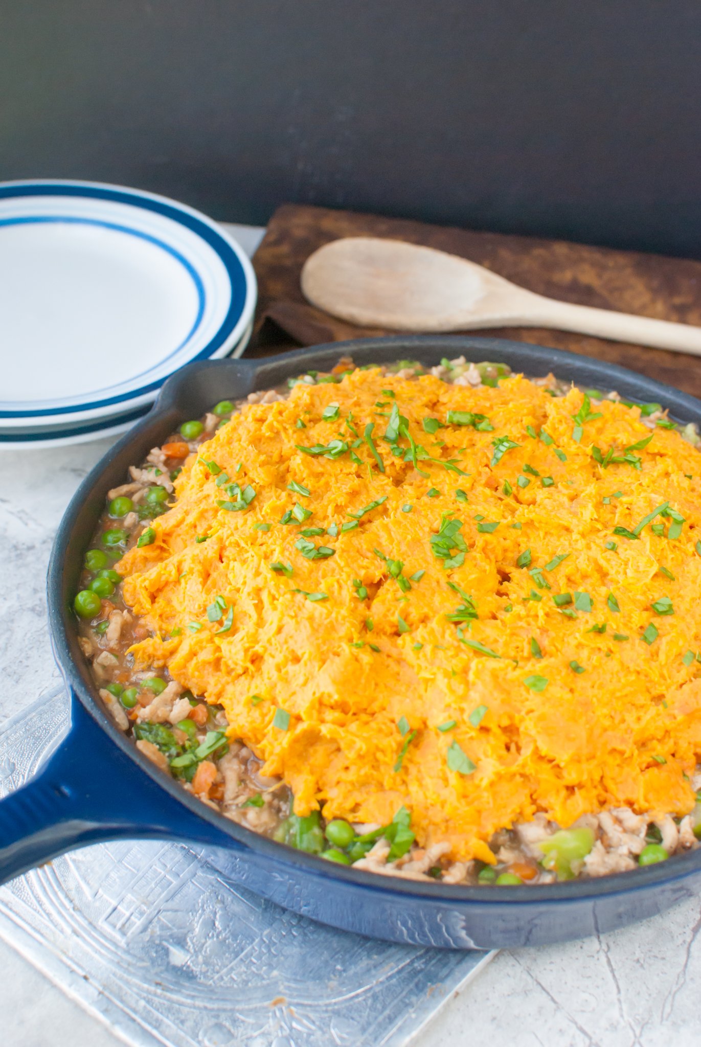 Now spread your mashed sweet potatoes evenly over the top of turkey mixture