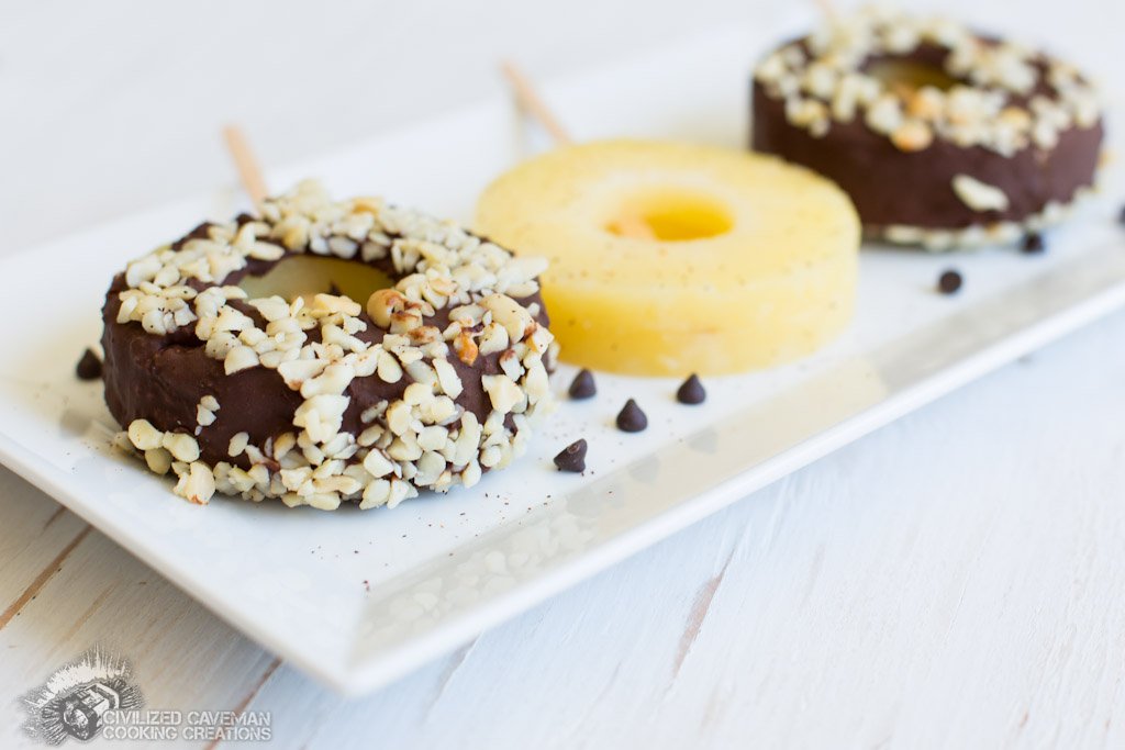 Dip your pineapple popsicles in the chocolate and then dip in the macadamia nuts and set back on your baking sheet