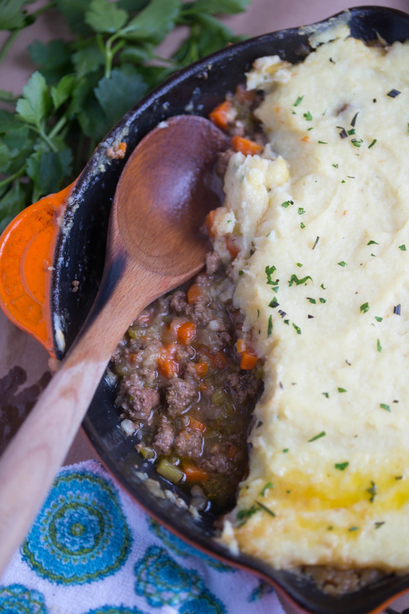 Pour in beef broth, loosening any browned bits on the pan, sprinkle in salt and pepper, stir, then simmer until the liquid has reduced by a little over half. Stir in rosemary & parsley.