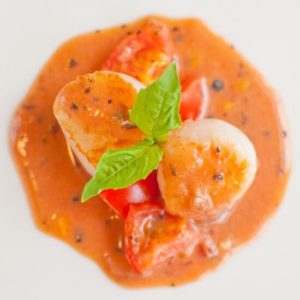 Place in oven and cook until the tomatoes start to brown and the sauce is bubbling. Should take about 10 minutes for medium sized scallops to cook through.