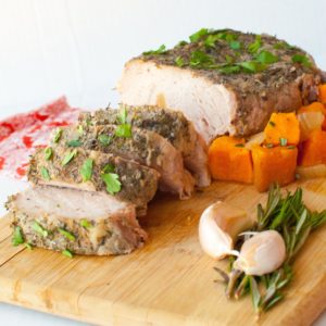 Poke 5 deep holes throughout your pork loin and insert a clove of garlic into each one