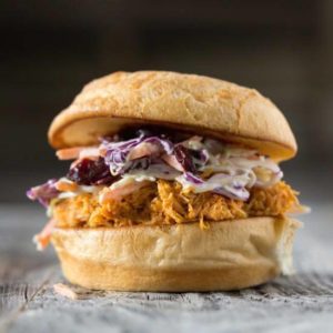 Once done cooking, shred chicken in the crockpot using a handmixer (video above) or by hand
