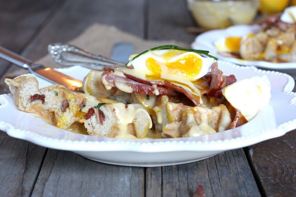 Blend for about 30 seconds until the sauce has thickened and the butter is well incorporated. The sauce will continue to thicken as it cools.***If it gets too thick, warm it over very low heat until it becomes runny again (about 10 seconds in a microwave and a minute on a low burner). Be careful not to use too high of heat or your eggs will scramble and your butter will curdle.***Layer each waffle with a slice of ham, poached egg, drizzle of hollandaise, and a few chives.