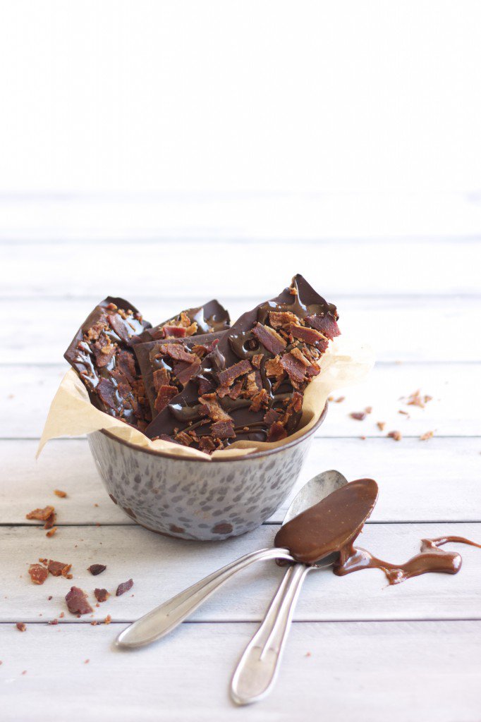 Drizzle the caramel over the chocolate and sprinkle the top with crumbled crisp bacon