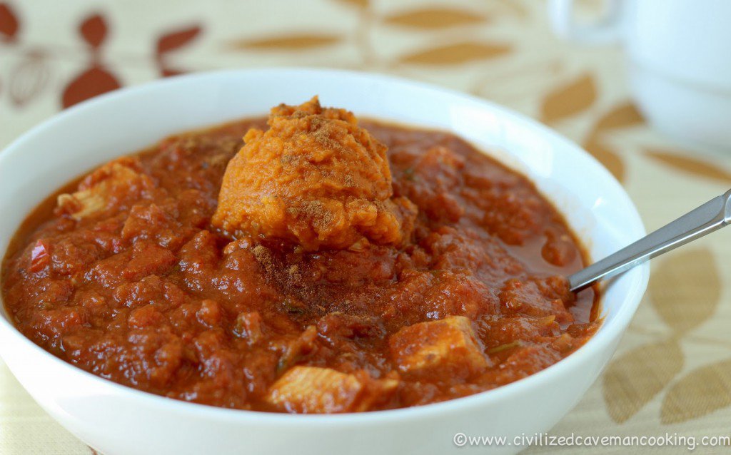 Add in your chicken, chicken stock, white wine, organic tomatoes, organic tomato paste, chili powder, pumpkin pie spice, coriander, salt, and cinnamon stick and simmer for 20 minutes