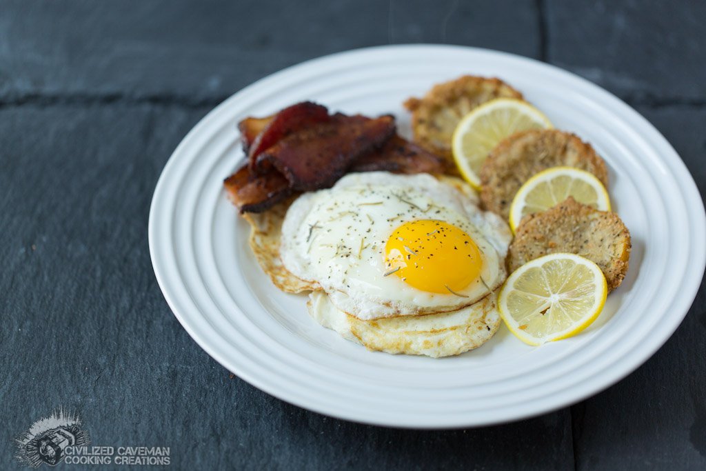 I then cooked 3 sunny side up eggs sprinkled with rosemary and pepper in a saute pan over medium heat and served them with the lemons