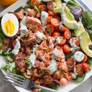 In two medium bowls, combine spring mix, tomatoes, avocado, egg, and chopped bacon. Top each salad w/ a salmon steak, drizzle with creamy lemon vinaigrette, and sprinkle with fresh herbs.