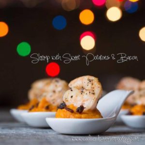 Now it's time to plate. Place a large spoonful of sweet potato on a plate, top with a shrimp and sprinkle with bacon.