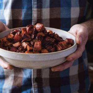 Roast for 20 minutes. Stir and continue roasting for 15 minutes, or until tender. Turn the oven to broil and brown the potatoes for an additional 5 minutes. Watch the nuts closely and pull the baking sheets out early if they begin to burn. Serve hot.
