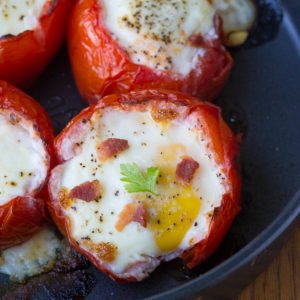 Place the tomatoes in a pyrex baking dish and bake for 40-50 minutes or until your eggs are fully cooked through